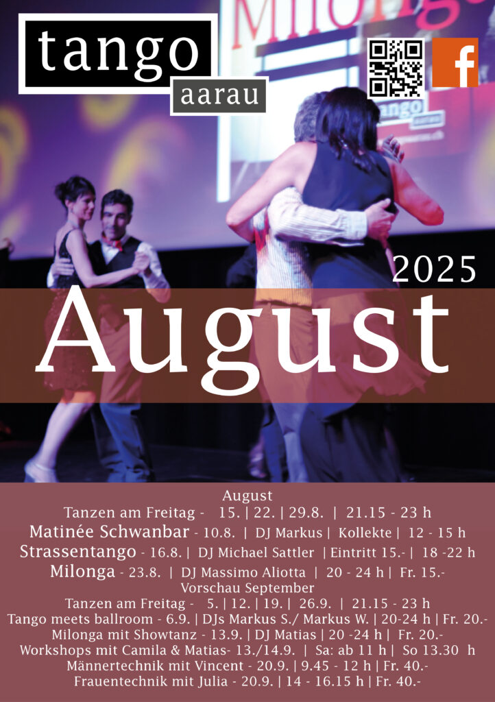 Allgemein AUGUST UND SEPTEMBER BEI TANGOAARAU! 25. Juli 2025 Bruno Schneider Nach der Sommerpause geht es weiter mit Schwanbar-Matineé, Strassentango und einer Milonga im Tanzlokal !