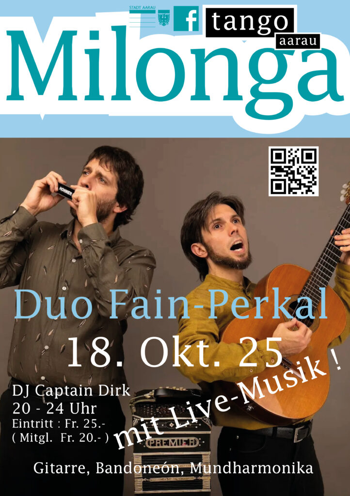 Allgemein, Veranstaltungstipps 18. OKTOBER : MILONGA MIT DUO FAIN-PERKAL ! 4. September 2025 Bruno Schneider Das Duo Fain-Perkal Tango ist 2016 in Buenos Aires,Argentinien entstanden. Es schlägt eine Tango-Schau von tieferMusikalität vor, in der die Konzertgitarre, das Bandoneón, diechromatische Mundharmonika und die Stimmen miteinander leben.