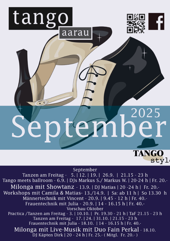 Allgemein SEPTEMBER UND OKTOBER BEI TANGOAARAU ! 3. September 2025 Bruno Schneider Es ist wieder was los bei uns in Aarau : Workshops, Showtanz und Milonga mi Live-Musik !